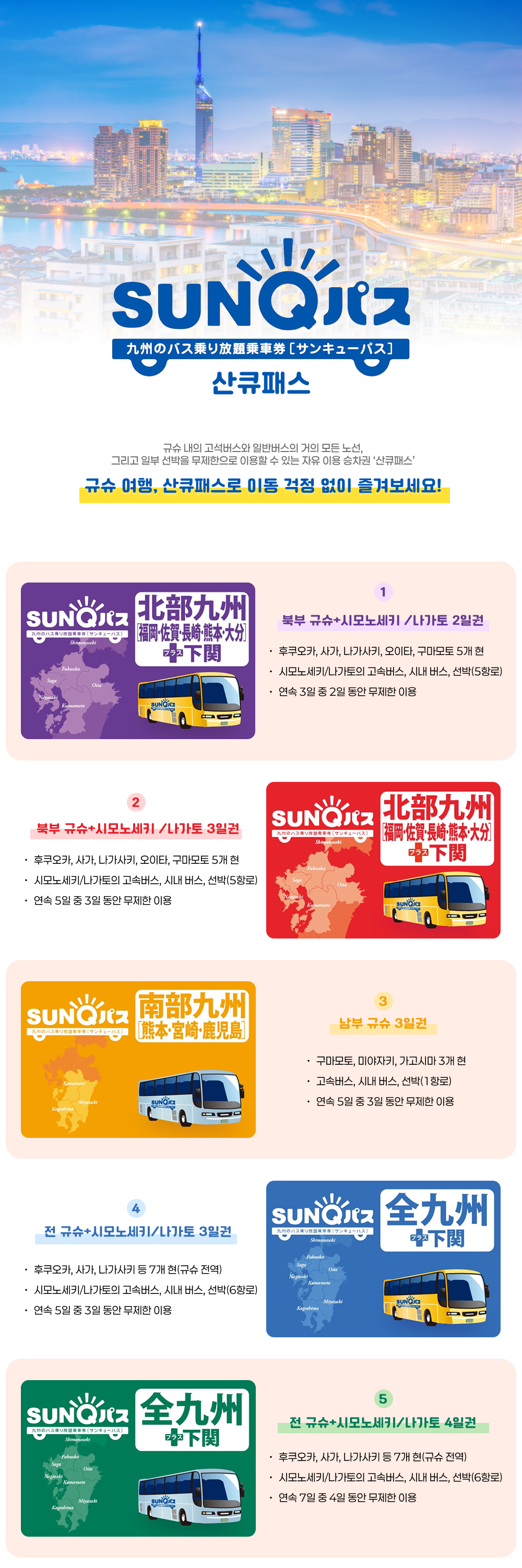 ▶ 2025년 7월 1일부터 후쿠오카~나가토유모토 온천 간 고속버스는 SUNQ 패스로 승차하실 수 없게 되었습니다. 대단히 죄송하지만, 해당 구간의 고속버스를 이용하실 경우에는 별도로 예약하신 후, 일반 운임을 지불하셔야 이용 가능하오니 양해 부탁드립니다.